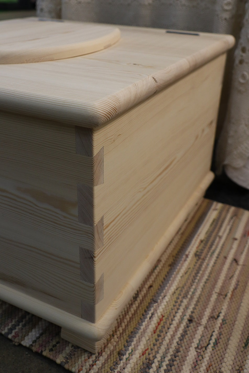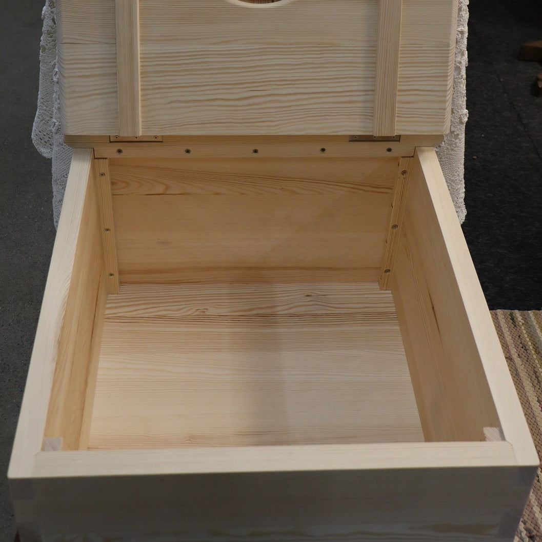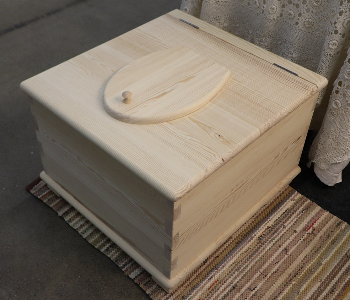 Käymälä valmistetaan männystä, kolme senttimetriä paksusta kokopuusta. Raaka-aine on mahdollisuuksien mukaan suomalaista mäntyä, muuten baltialaista mäntyä. Peruskorkean käymälän istumakorkeus on 42 cm, sama kuin tavallisen vesivessan korkeus. Vaihtoehtoisesti käymälään voi tilata korkeammat jalat, jolloin istumakorkeus nousee 46 cm:iin. Tämä vastaa monen ns. korkean vesivessan istuinkorkeutta. Valmistamme käymälästä kahta kokoa, pienen ja ison version. Pienen käymälän leveys edestä katsottuna on 55 cm ja syvyys 53,5 cm, ison käymälän vastaavat mitat ovat 59 cm ja 62,5 cm.