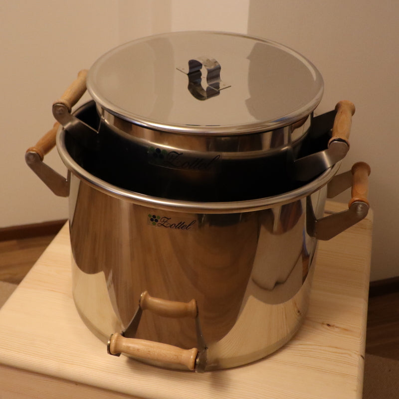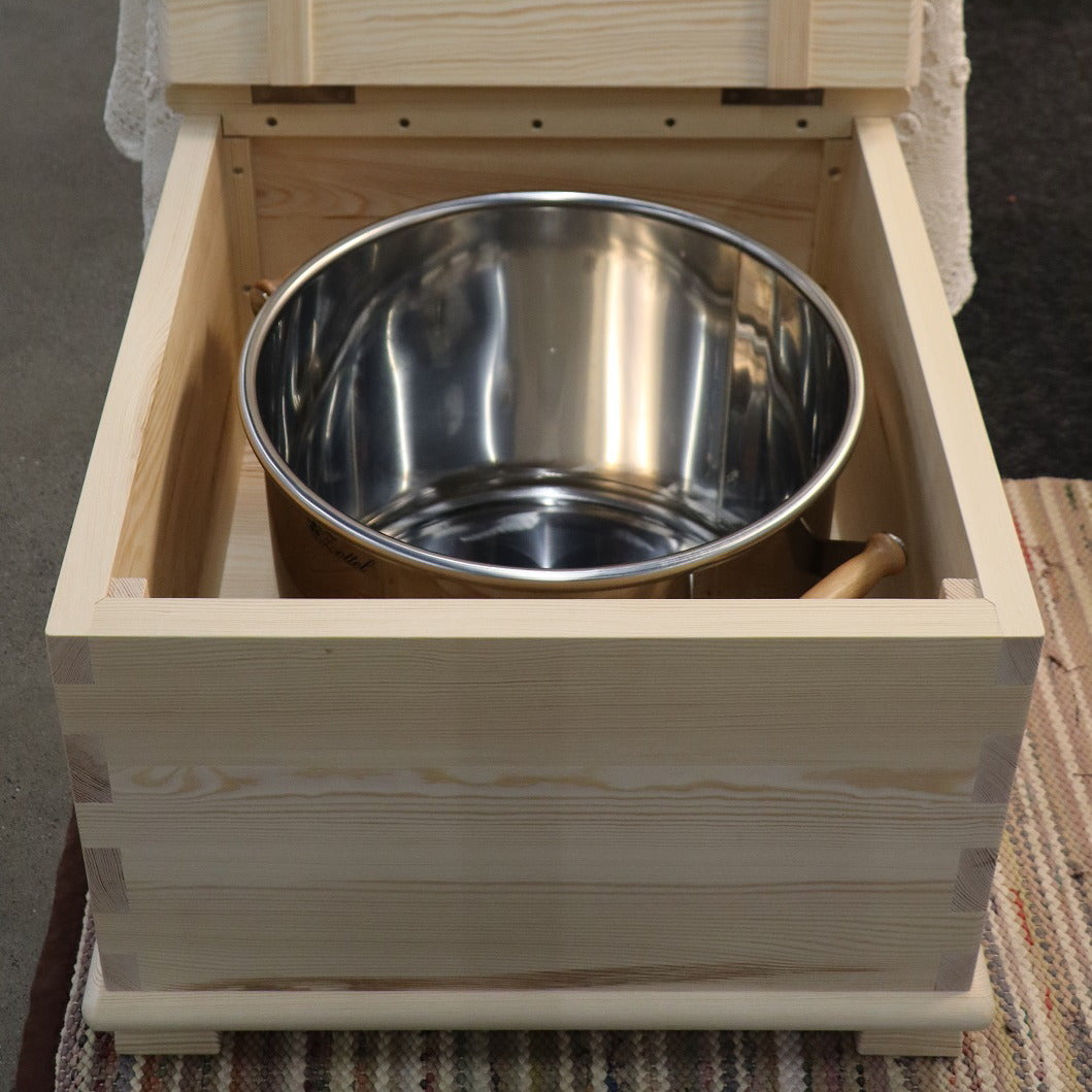 Myymme omiin kuivakäymäliimme sopivia 30 cm korkuisia 24 l ja 35 l sisäastioita ruostumattomasta teräksestä (AISI 304). Astiat on valmistettu slovenialaisessa Zottelin perheyrityksessä, joka on jo lähes 30 vuoden ajan tuottanut laadukkaita teräsastioita moniin tarkoituksiin. Astioissa on kaksi kantokahvaa sivussa ja kolmas kahva astian alareunassa, joka helpottaa astian tyhjentämistä. Tukevat astiat on tehty eurooppalaisesta teräksestä ja kantokahvoissa on käytetty käsittelemätöntä slovenialaista pyökkiä. Pienemmässä 24 litran astiassa pohjan paksuus on 1 mm ja seinien paksuus on 0,8 mm. Isommassa 35 litran astiassa pohjan paksuus on 1,5 mm ja seinien paksuus 1 mm. Pienen astian sisäläpimitta on 31,5 cm ja sen poikkimitta toisen yläkahvan ulkoreunasta vastakkaisen puolen kahvan ulkoreunaan on 44 cm. Ison astian vastaavat mitat ovat 39,5 cm ja 52 cm. Pieni astia painaa n. 5 kg, iso n. 6 kg. Astiat ovat siis suht’ painavia tyhjinäkin ja voivat siksi tuntua joidenkin mielestä liian painavilta. Siinä tapauksessa voi käyttää omaa kevyempää sisäastiaa. Tästä syystä teräsastiat ovat käymälöiden valinnaisia tarvikkeita. Astioiden mukana tulee kansi.