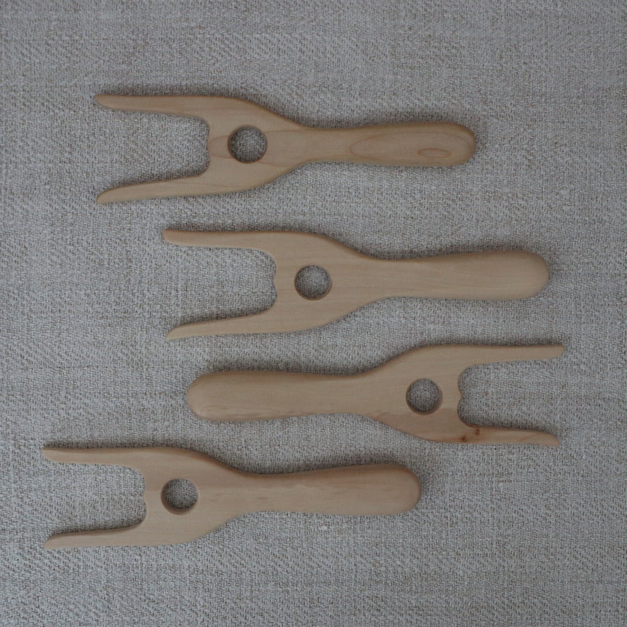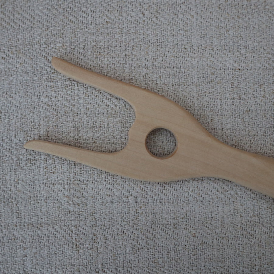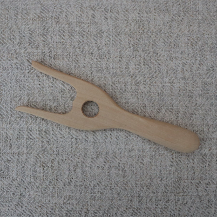 Tämä nyörihaarukka on Ekovekotin Oy:n itse suunnittelema ja se valmistetaan meille käsityönä pienessä suomalaisessa puuverstaassa. Sen muotoa on haettu vanhoista antiikkisista malleista. Reikä on reilunkokoinen (halkaisija n. 1,6 cm), jotta paksumpikin nyöri mahtuu siitä läpi. Piikkien väli on n. 4 cm ja haarukan kokonaismitat ovat n. 17 cm x 4,8 cm x 1,5 cm. Varsi on paksumpi kuin muut osat ja joka suunnalta pyöristetty, joten se istuu mukavasti kämmeneen. Yläosa on n. 0,7 cm paksua.