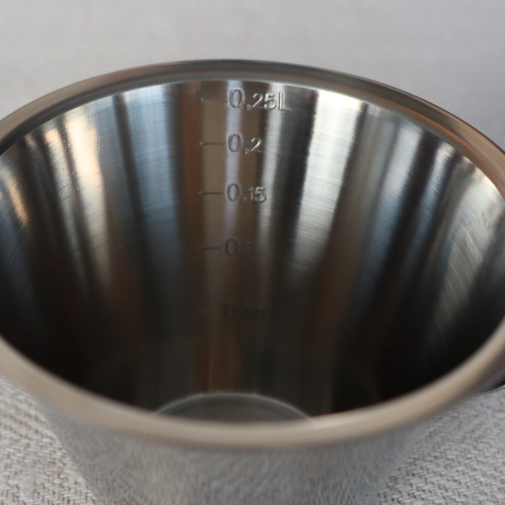 Mitan ulkohalkaisija yläreunassa (ilman kahvaa) on 10 cm ja sen korkeus on 7,2 cm. Astian sisäpinnalta löytyvät vastakkaisilta puolilta sekä eurooppalainen että amerikkalainen mitta-asteikko. Eurooppalaisessa asteikossa on 5 viivaa mitta-arvoineen puolen desilitran välein (0,05-0,1-0,15-0,2-0,25 l) ja amerikkalaisessa kaksi viivaa, joissa lukee “0,5 cup” ja “1 cup”. Mitta-astiassa ei ole kaatonokkaa.